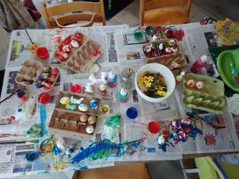 Im Frühling pflanzen wir Gemüse an, pflegen und Ernten es später. Das Basteln mit versch. Materialien regt die Fantasie an und fördert die Motorik. Z.B. sammeln wir im Herbst Kastanien, im Winter basteln wir Gestecke, zur Osterzeit verzieren wir Eier...